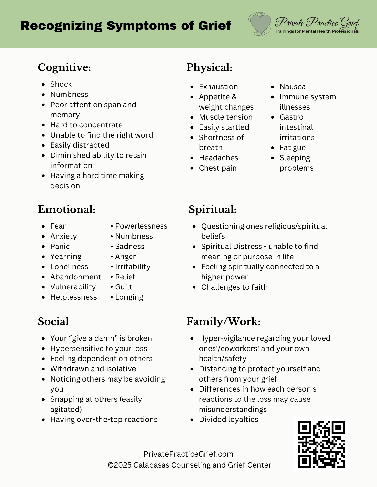 Physical symptoms associated with grief, may overlap with symptoms of medical conditions. While these are common responses to loss, it’s essential to encourage clients to consult a healthcare professional if symptoms persist, worsen, or cause significant concern. Addressing physical health alongside emotional and mental well-being ensures a comprehensive approach to healing.